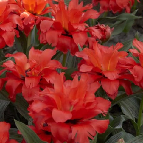 Eine späte Sorte der roten Pfingstrosen-Tulpen von Greig (Tulipa greigii Double Red Riding Hood). Die Höhe der Stiele beträgt 35 cm.