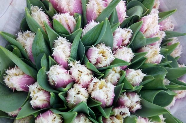 Bezieht sich auf weiße Pfingstrosen-Tulpen. Der Stiel ist bis zu 40 cm lang. Die großen Knospen des Mount Tacoma sehen beim Schneiden perfekt aus. Sie sind 6 cm hoch und haben einen Durchmesser von 11-12 cm.
