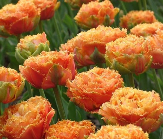 Der Stiel von Sensual Touch ist ziemlich hoch - bis zu 55 cm. Die Form und Struktur der Blütenblätter ermöglicht es, die Sorte als Frottee-Pfingstrosen-Tulpen zu klassifizieren. Ihre Farbe ist tief orange, rund um den Umfang gelblich.