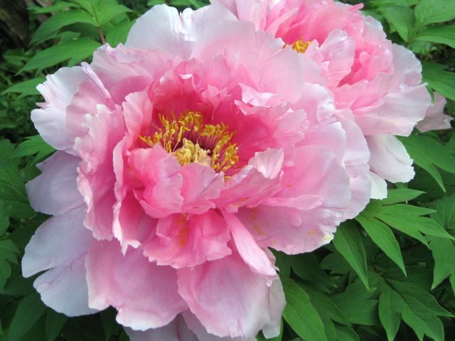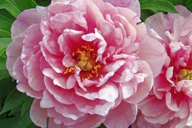 Pink Double Dandy ist eine Hybride und kombiniert die Vorzüge von Baum- und Kräutersorten. Die Stängel der Pflanze sind hoch, bis zu 60 cm, gefüllte Blüten sind zuerst dunkel und erhellen sich dann ein wenig. Auf dem Foto einer blassrosa Pfingstrose sind hellgoldene Staubblätter in der Mitte deutlich zu erkennen. Die Sorte öffnet Mitte Juni und kann ca. 3 Wochen attraktiv bleiben.