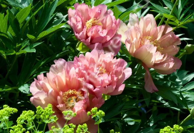 Pink Lemonade oder Pink Lemonade blüht mit wunderschönen korallenrosa Knospen mit einem "flauschigen" gelblichen Zentrum, das aus reichlich langen Staminoden besteht. Es wächst bis zu 80 cm, die Blüten sind groß, aber der Busch fällt nicht unter ihr Gewicht. Die Sorte öffnet um den 20. Juni und bleibt ca. 3 Wochen dekorativ.