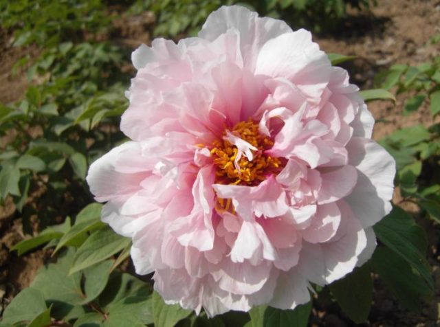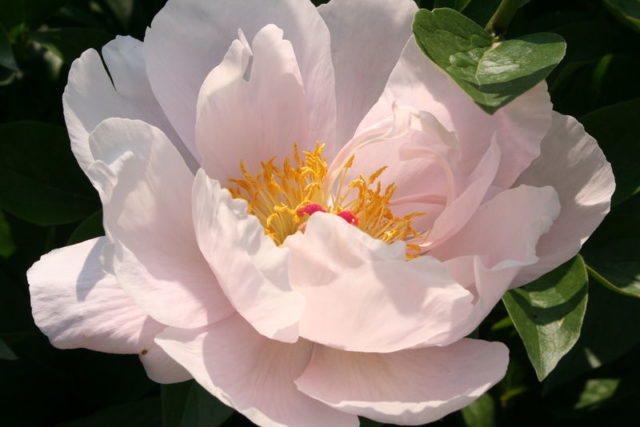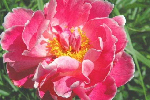 Die hauptsächliche dekorative Wirkung der perlmuttstreuenden Pfingstrose wird durch dichte Staubblätter in der Mitte der Blume gegeben