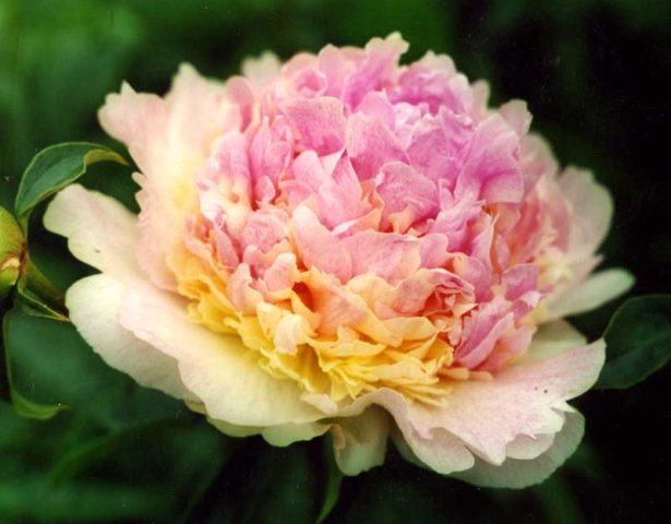 Zhao Yuan Fen oder Rosengarten ist eine wunderschöne mehrjährige Pflanze mit einer Höhe von bis zu 90 cm. Die Blüten der Sorte sind kugelförmig und von sehr zartem Farbton. Auf dem Foto einer weiß-rosa Pfingstrose sehen sie aus wie Luftwolken. Es blüht spät, Anfang Juli, und kann den Garten bis August schmücken. Die Knospen der Pflanze sind mittelgroß, bis zu 13 cm, erscheinen aber sehr häufig auf den Büschen.