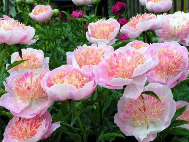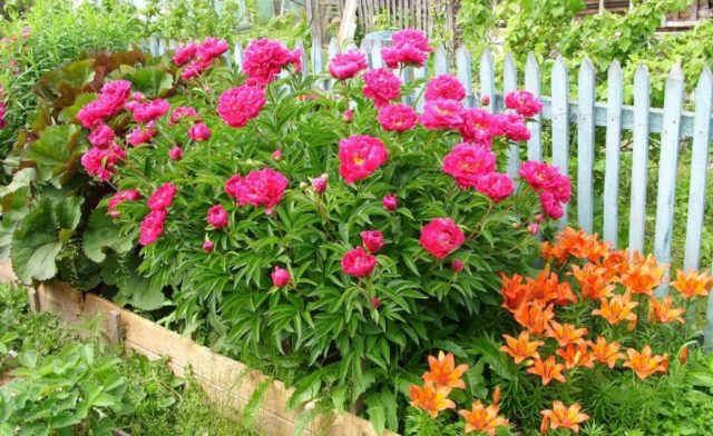 Pfingstrosen schmücken erfolgreich den Raum in der Nähe von Zäunen in zusammengesetzten Blumenbeeten
