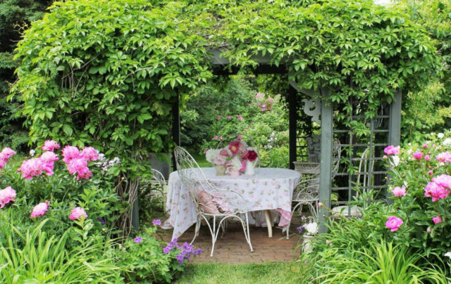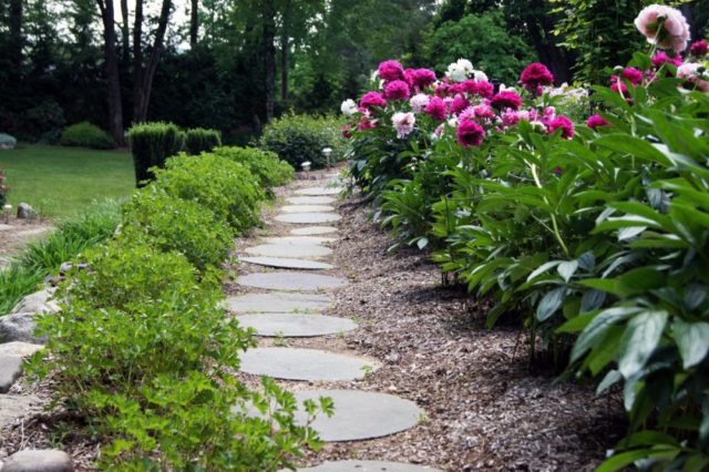 In der Gartengestaltung spielen Pfingstrosen immer die Rolle eines hellen Akzents. Meistens werden diese mehrjährigen Blumen in "zeremoniellen" Bereichen gepflanzt, zum Beispiel: