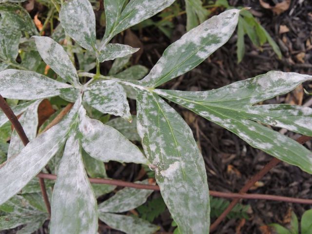 Mehltau der rosa Pfingstrose ist leicht an einer weißlichen Blüte auf den Blättern zu erkennen.