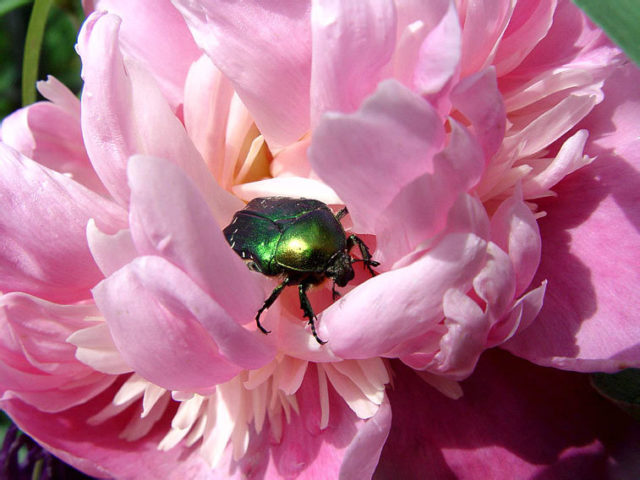 Der Bronzekäfer ernährt sich von Pfingstrosenknospen und kann Blüten brechen