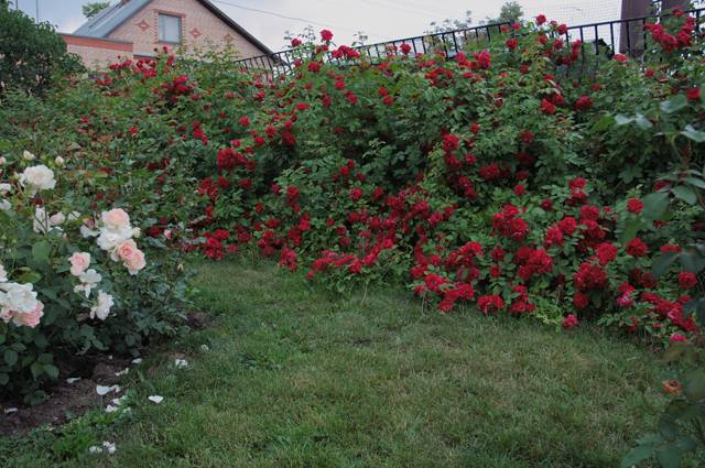 Großblumige Sorten von Kletterrosen brauchen nicht immer Unterstützung. Wenn die Pflanze kräftige aufrechte Stängel hat, die nach Erreichen einer bestimmten Länge hängen und auf dem Gelände genügend Platz vorhanden ist, können Sie sie nicht zusammenbinden. Sie können verwendet werden, um eine schöne Hecke in einem großen Bereich zu bilden, der nicht viel Wartung erfordert. Sie müssen nur berücksichtigen, dass Kletterrosen frei wachsen, daher ist es nicht möglich, einer solchen Hecke eine strenge geometrische Form zu geben.