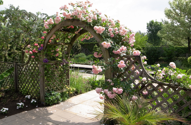 Sie können viele von ihnen mit Kletterrosen dekorieren: Pavillons, Gitter, Pergolen, Bögen. Vom Beginn des Nachwachsens der Triebe an werden sie vorsichtig entlang der Stütze geführt und mit einem starken Draht in einer Plastikhülle zusammengebunden.