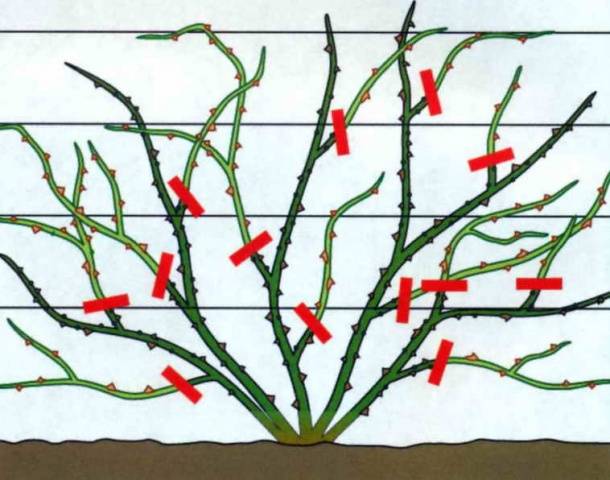 - Alle schwachen und getrockneten Triebe werden aus der Pflanze herausgeschnitten. Seitentriebe werden um ein Drittel geschnitten.