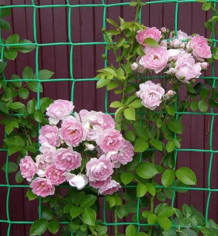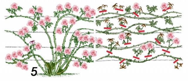 Die Pflege einer auf diese Weise gebundenen Kletterrose wird nicht einfach sein. Es ist noch schwieriger, eine solche Struktur für den Winter zu schützen, aber die Wand, die mit schönen duftenden Blumen geschmückt ist, wird so spektakulär sein, dass sich alle Anstrengungen mehr als auszahlen.