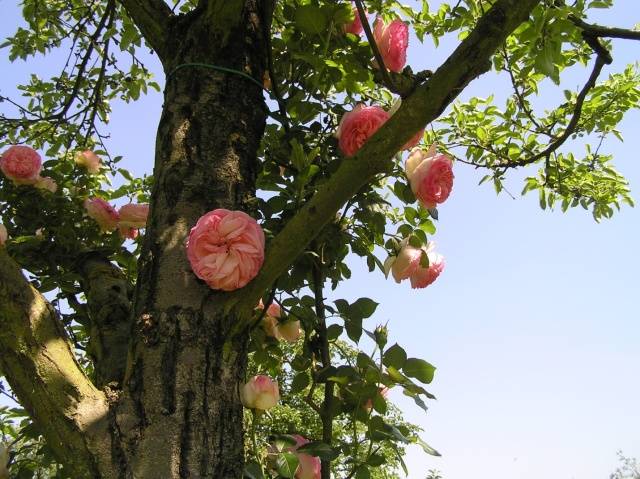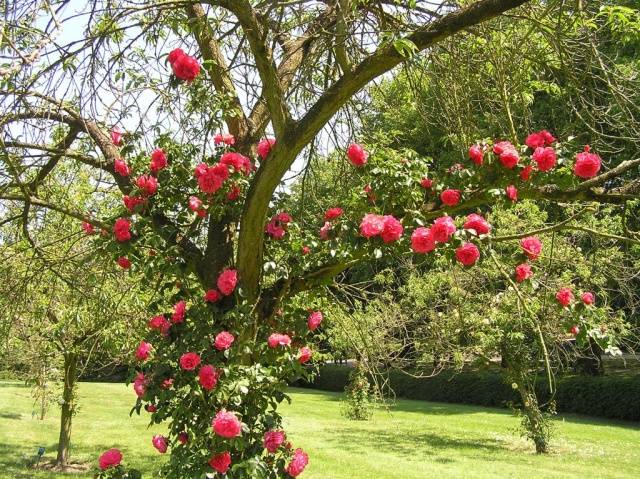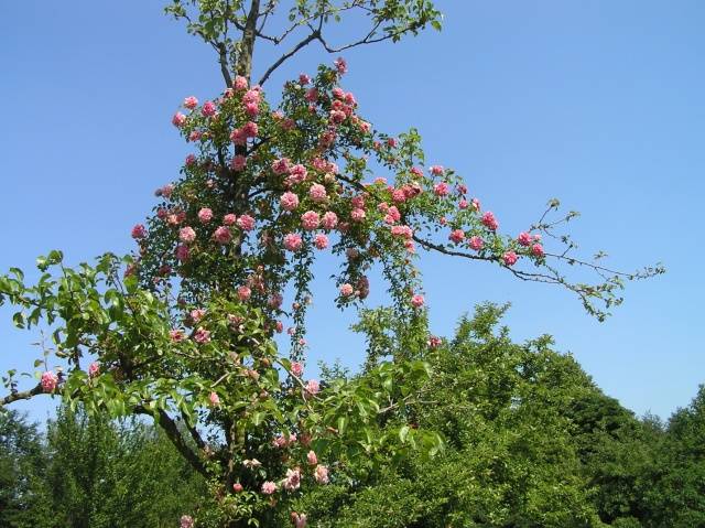 Sie können uns widersprechen, die sie wiederholt gesehen haben auf der Datscha von Nachbarn oder in einer Zeitschrift auf dem Foto KletterroseWer auf einen Baum klettert und kein Strumpfband ist dort zu sehen. Dies wird einfach erklärt - junge Triebe einer Kletterrose sind nach oben gerichtet und hängen nach Erreichen einer bestimmten Höhe herab. Die Dornen solcher Pflanzen sind normalerweise sehr groß, sie klammern sich an einen nahe gelegenen Baum, junge Seitentriebe wachsen auf und zur Seite, umgehen das Hindernis in Form von Zweigen und greifen dann nach ihnen. Infolgedessen sind der Baum und die Kletterrose so miteinander verflochten, dass es selbst bei starkem Verlangen nicht funktioniert, sie auszuhaken.