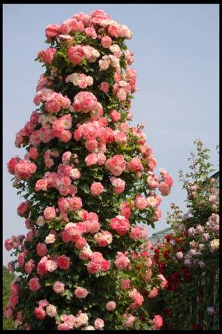 Um eine Säule oder ein Stativ herum werden junge Triebe von Kletterrosen einfach in eine Spirale gewickelt und sorgfältig gebunden.