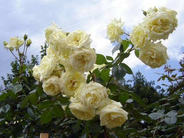 Einige kletternde großblumige Rosen benötigen jedoch nach einigen Jahren möglicherweise Unterstützung.Graben Sie dazu ein paar Verstärkungsstücke oder Holzpfosten um die Pflanze herum und verbinden Sie sie entweder mit einem starken dicken Seil oder mit Querstangen. Flexible Zweige bedecken die Stützen und die Pflanze wird widerstandsfähiger und schöner.