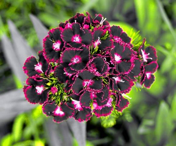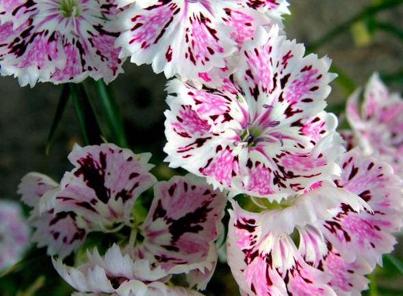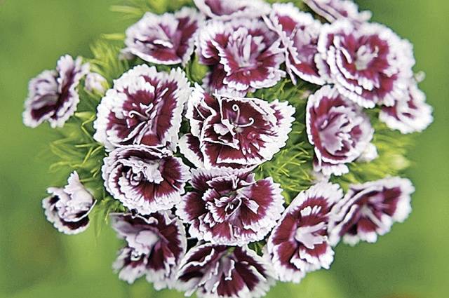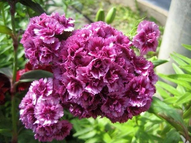 Oft werden Nelken entsprechend der Komplexität der Blütenstände in Gruppen eingeteilt: einfach, halbgefüllt, Frottee. Die Palette der kugelförmigen Blütenstände ist erstaunlich - von blendendem Weiß bis zu strengen burgunderfarbenen Farben. Typischerweise wird das Farbschema durch zwei kontrastierende Farben dargestellt.Es gibt jedoch Sorten, bei denen Blumen 3 oder sogar 4 verschiedene Farbtöne kombinieren.