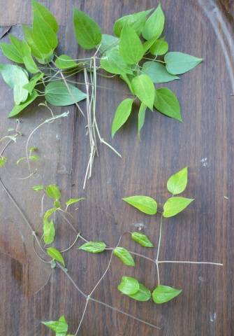 Aus den Seitentrieben der wachsenden Pflanze werden grüne Stecklinge geschnitten. Beachten Sie beim Schneiden des Materials, dass sich am ausgewählten Trieb keine Knospen befinden sollten. Entfernen Sie die Oberseite des Triebs und schneiden Sie den Rest des Clematis-Zweigs in gleiche Stecklinge. Jeder Schnitt sollte 2 Internodien haben.