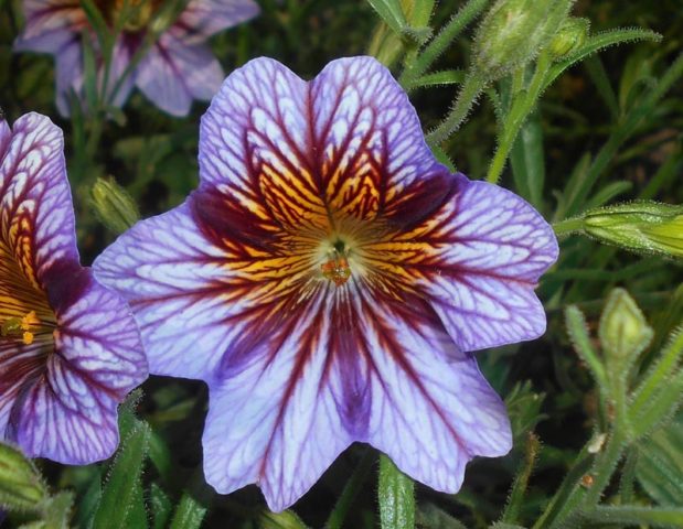 Die Farbe der Salpiglossis-Blüten fasziniert durch eine Kombination von Schattierungen, und die innere Oberfläche der Blütenblätter schimmert dank des Musters dünner Adern im Licht wie Perlmutt