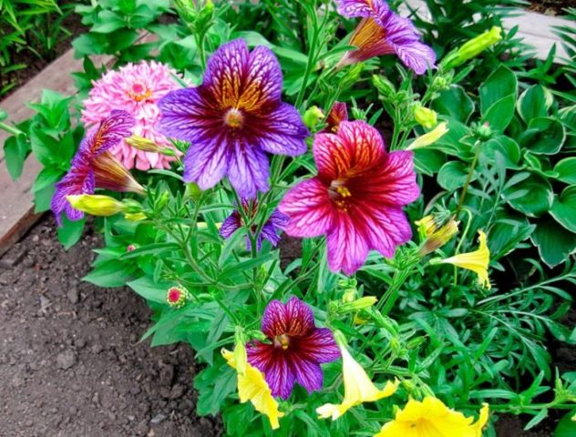 - Pflanzen neben Nadelsträuchern und Bäumen, die die Helligkeit und exotische Schönheit von Salpiglossis betonen können;
