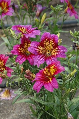 Die Höhe der Büsche dieser Hybridsorte erreicht 40-60 cm. Die Stängel der Pflanze sind stark verzweigt.Die Blüten sind relativ klein (6-7 cm). Die Farben der Blütenkrone kombinieren verschiedene Schattierungen von Rot, Gelb und Lila. Salpiglossis Bolero wächst gut in der Sonne und im hellen Halbschatten.
