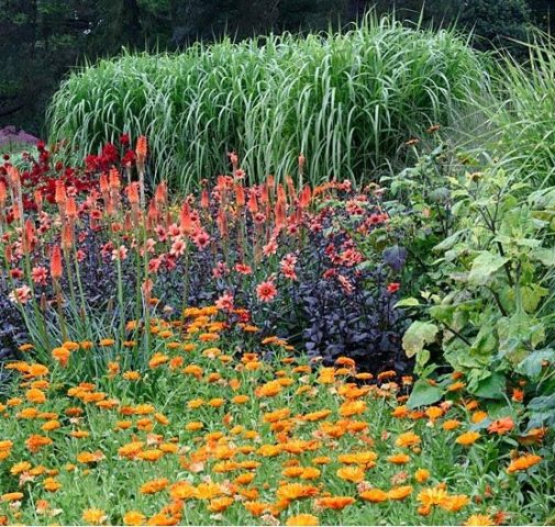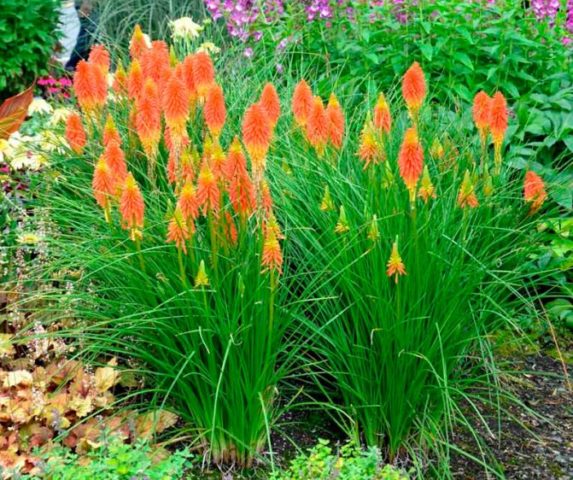 Knifofia sieht auf jedem Blumenbeet attraktiv aus - sowohl in einer einzigen Bepflanzung als auch in Kombination mit anderen Zierpflanzen. Die Blume wird normalerweise an offenen Stellen gepflanzt und ist auch in verschiedenen Kompositionen enthalten:
