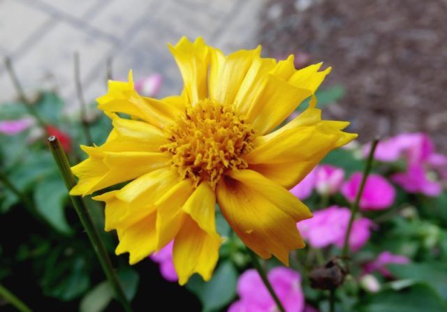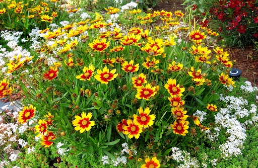 Helle zweifarbige Coreopsis-Blütenblätter sind auch in abgelegenen Ecken des Gartens deutlich sichtbar