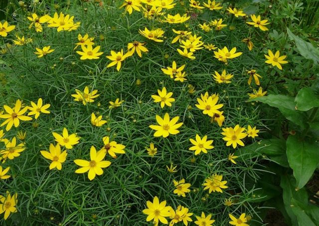 Die quirlige Art (Verticillata) ergibt kräftige, kräftige Büsche bis zu einer Höhe von 100 cm. Die Blätter sind sehr schmal, daher ähneln sie Nadeln von dunkelgrüner Farbe. Die Blüten sind klein, 2-3 cm im Durchmesser, aber zahlreich. Darüber hinaus fallen sie mit ihrer leuchtend gelben Farbe auf, die vor dem Hintergrund von Laub besonders attraktiv wirkt. Die Blüten dieser mehrjährigen Coreopsis ähneln Sternen.