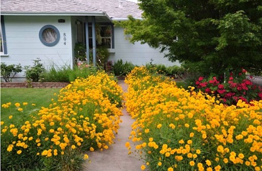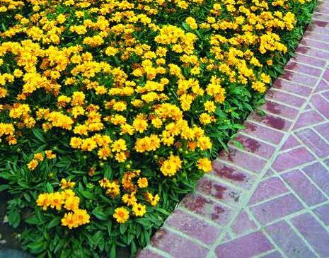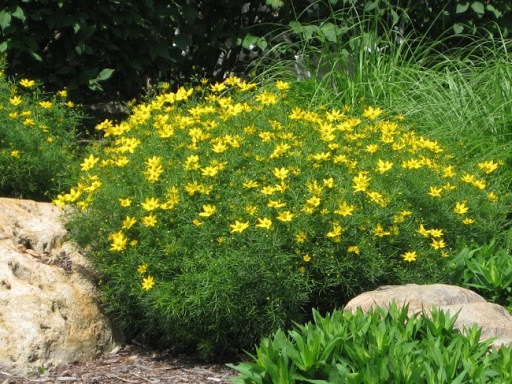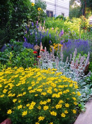 Das Foto zeigt einige interessante Optionen für die Verwendung von mehrjähriger Coreopsis zur Dekoration eines Gartens: