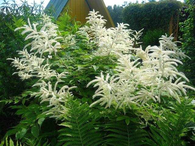 Oder ein anderer Name Aruncus wächst gut in sonnigen und schattigen Gebieten. Die Pflanze sieht aufgrund ihrer Größe und weißen Blüten in Form von Rispen mit einem angenehmen Aroma spektakulär aus. Sie blüht ab Juli etwa einen Monat lang, dann werden die verblassten Rispen abgeschnitten, wobei das Laub zurückbleibt und die Stängel im Herbst geschnitten werden. Wolzhanka wird durch Teilung propagiert.