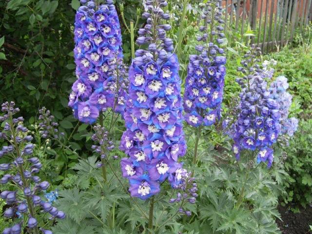 Hohe Pflanze, in dem Blüten auf einem langen Stiel in Blütenständen in Form einer länglichen Pyramide gesammelt werden. Delphinium blüht von Juni bis Juli, und eine Herbstblüte ist möglich, wenn die ersten Blütenstiele abgeschnitten werden. Pflanzen lieben sonnige Gebiete. An einem Ort lebt eine Blume bis zu 10 Jahre. Wenn die Blumen wachsen, müssen sie ausgedünnt werden. Schneiden Sie dazu die zusätzlichen Stiele aus dem Mittelteil aus und lassen Sie 5 Stiele übrig. Die Blume muss möglicherweise zusammengebunden werden. Delphinium vermehrt sich durch Stecklinge und das Teilen des Busches. Die Blume liebt fruchtbaren Boden, reagiert gut auf Bewässerung und Düngung mit Düngemitteln mit Stickstoff, Kalium und Phosphor in der Zusammensetzung. Beliebte mehrjährige Sorten: Princess Caroline, Snow Lace, Pink Butterfly.