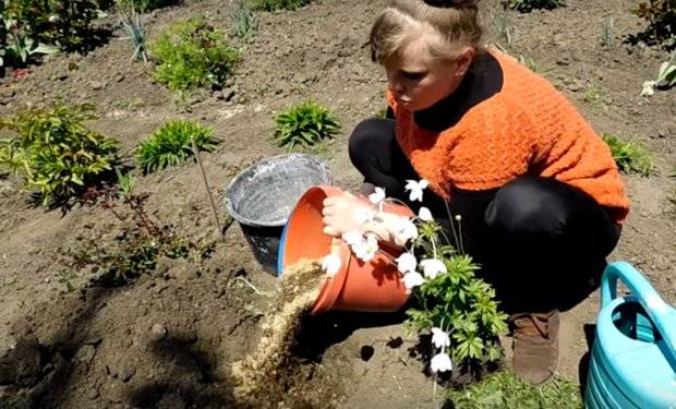 Um zu überprüfen, ob die Anemone bewässert werden muss, befeuchten Sie den gesamten Boden im Garten und nicht nur das Loch.Dann reicht es aus, ein 10 cm tiefes Loch neben den gepflanzten Pflanzen zu graben, eine Handvoll Erde zu nehmen und sie in die Faust zu drücken.