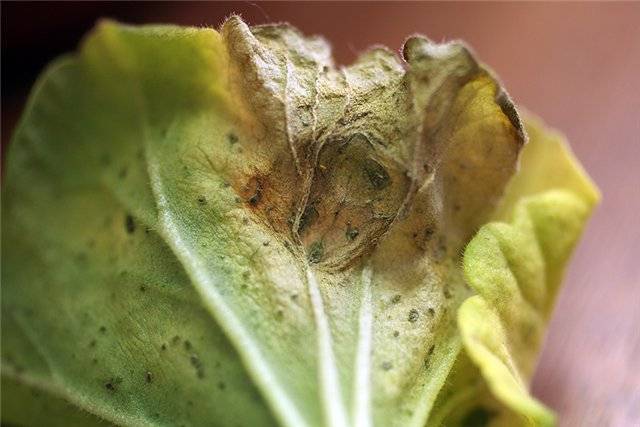 Infolge dieser Krankheit treten auch braune Flecken auf, die schnell schwarz werden und alles endet in Blattnekrose.