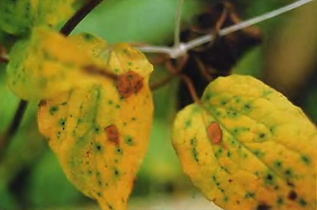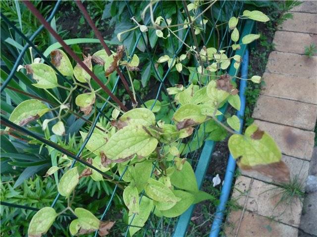 Das Ergebnis dieser Krankheit sind normalerweise Flecken auf den Blättern von Clematis mit einer ockerfarbenen, gelblichen Tönung.