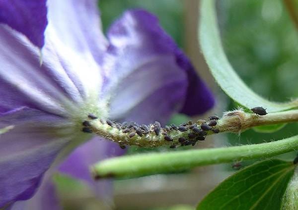 Zu Beginn des Wachstums sollten die Spitzen der jungen Blätter der Clematis und ihr Rücken regelmäßig auf die Ansammlung dieser Schädlinge untersucht werden.Im Frühjahr können sich Schädlinge nicht alleine bewegen - Ameisen helfen ihnen, sich zu bewegen. Und näher am Sommer, wenn ihre Zahl unangemessen zunimmt, um sich selbst zu ernähren, haben neugeborene Individuen Flügel und erwerben die Fähigkeit, in benachbarte Pflanzen zu ziehen.