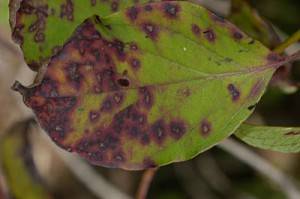 Askochitis verursacht dunkelbraune Flecken, die Entwicklung der Krankheit führt zum Auftreten von Löchern an Stellen mit geschädigtem Gewebe.