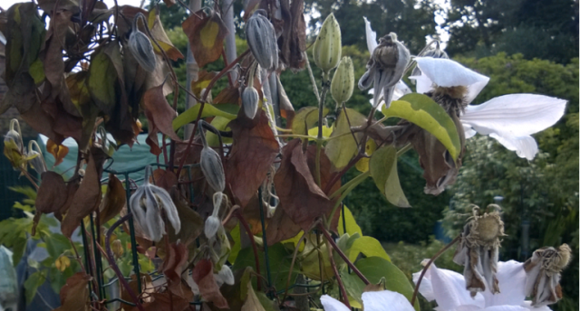 Infolge extremer Hitze und Trockenheit können Clematis-Triebe rot werden. In diesem Fall müssen sie Schatten und Wasser intensiver erzeugen.