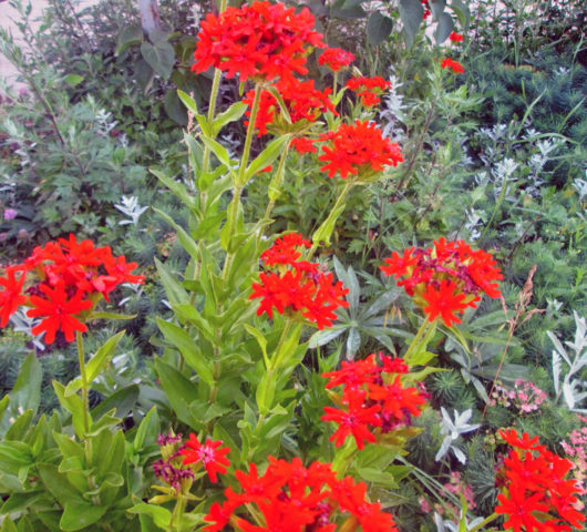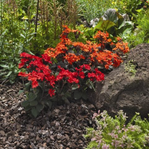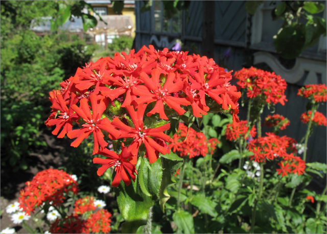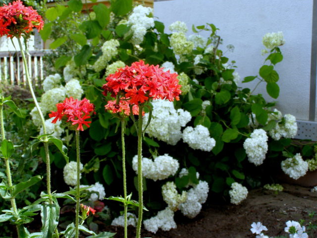 Im Folgenden finden Sie einige Beispiele mit einem Foto der Verwendung von Likhnis-Chalzedon bei der Gestaltung der Landschaft eines Gartens oder eines Sommerhauses.