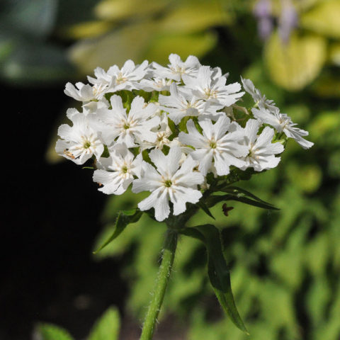 Likhnis Chalcedon Rauraife mit weißen panikförmigen Blütenständen und großen Blüten. Die Pflanze gehört zu einer verkümmerten Form und bildet einen dichten, kompakten Busch mit einer Höhe von 50 cm.