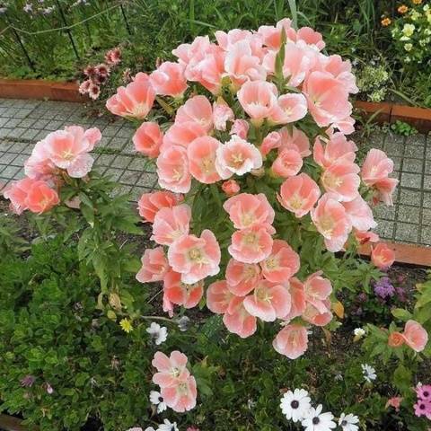 Kompakte Büsche, bis zu 30-40 cm groß. Die Stängel dieser Godetia sind grünlich oder rosa gefärbt. Die Blätter sind spitz, stark länglich. Die Blüten haben eine halbgefüllte Struktur, ihre Farbe ist weicher Lachs. Die Blütenblätter neigen dazu, sich von der Mitte bis zum Rand aufzuhellen und eine rosa Farbe anzunehmen. Der Durchmesser der Blütenstände ist groß genug - ca. 5 cm.