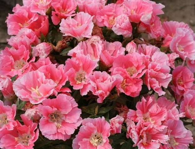 Eine Doppelsorte mit halbkugelförmigen, kompakten Büschen, bis zu 30-35 cm hoch. Die Blätter der Godetia sind lanzettlich, länglich und die Triebe sind grünlich-rosa gefärbt. Die Ränder der Blütenblätter sind gewellt, die Blüten sind rosa gestrichen, entlang des Randes sind sie mit kleinen roten Flecken bedeckt. Der Durchmesser der Blume beträgt 5-6 cm, die Ränder der Blütenblätter sind leicht eingerückt.
