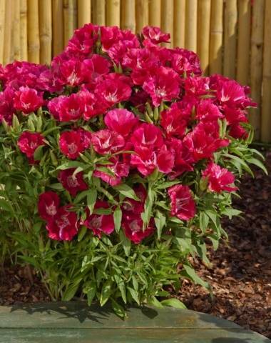 Großblütige Godetia, zum Pflanzen auf offenem Boden, in Töpfen, Kisten. Luxuriöse üppige Büsche mittlerer Höhe erreichen 40 cm. Die Blüten sind groß und in einer satten rosa Farbe bemalt. Der Durchmesser der Blüte variiert zwischen 5 und 8 cm, die Ränder der Blütenblätter sind wellig, was das Blütenstandsvolumen ergibt. Die Godecy-Blüte dauert von Juli bis Oktober.