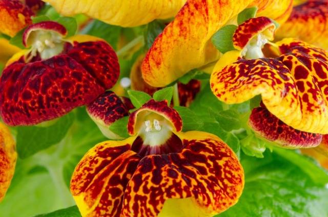 Der Name der Gattung kann aus dem Lateinischen als "kleiner Schuh" übersetzt werden. In der Tat erinnert die ursprüngliche Form der Blume an einige Assoziationen mit diesem Schuh. Calceolaria-Pflanzen können unterschiedlich hoch sein - von 10 bis 50 cm. Sessile Blätter, die sich häufig auf einem aufrechten Stiel befinden, bilden so etwas wie eine Rosette. Blätter können verschiedene Formen haben, aber sie sind notwendigerweise auf beiden Seiten mit Pubertät bedeckt. Die Blüten scheinen aus zwei Lippen zu bestehen, und die obere ist so unentwickelt, dass sie fast unsichtbar ist, aber die untere ähnelt einem leicht abgeflachten Ballon. Das Farbschema ist sehr hell und abwechslungsreich. Gelb, Orange, Creme und verschiedene Rottöne überwiegen, aber Flieder, Rosa und Blau sind zu finden. Die Farbe der Calceolaria kann einheitlich sein, jedoch häufiger in verschiedenen Farbtönen mit Originalmustern, wie auf dem Foto (Tiger, Marmor, mit Flecken unterschiedlicher Größe vor einem Hintergrund kontrastierender Farben).