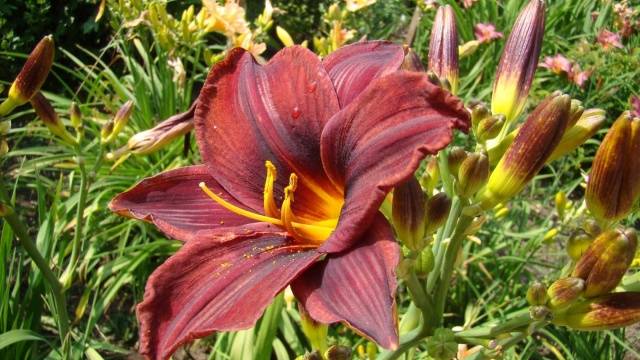 - Die Blüten sind sehr groß. Die Standardfarben sind Gelb, Rot, Orange. Bei sortenreinen Blüten ist das Farbsortiment viel breiter - rosa, burgund, lila, dunkelbraun, lila. Die Blüten sind sechsteilig, trichterförmig und haben eine kleine Röhre. Taglilienblütenstände bestehen aus 2-10 Blüten. Auf einem Stiel blühen gleichzeitig 1-3 Blüten. Die Blütezeit jeder Blume beträgt einen Tag. Bei einigen Pflanzensorten blühen die Blumen am Nachmittag oder am späten Nachmittag. Die durchschnittliche Blütezeit einer Pflanze beträgt 25-30 Tage.