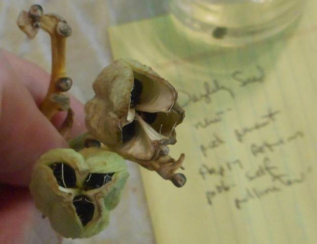 - Die Frucht ist eine dreieckige Samenkapsel, die eine kleine Menge schwarzer, glänzender Samen enthält.
