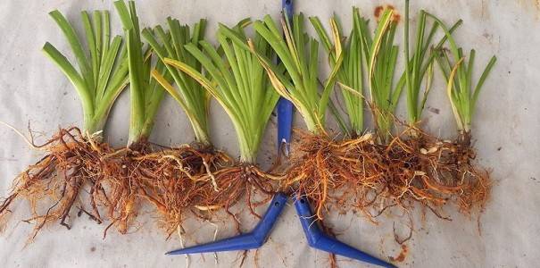 Untersuchen Sie die abgetrennten Taglilienbüsche und entfernen Sie abgestorbene Wurzeln. Schneiden Sie gesunde ein wenig ab. Dies stimuliert die Bildung und das Wachstum neuer Wurzeln. Die Blätter der Taglilie werden auf eine Höhe von 20-25 cm geschnitten, damit die Pflanze ihre ganze Kraft in die Wurzelbildung stecken kann.