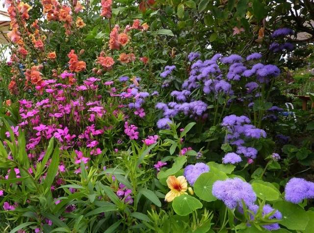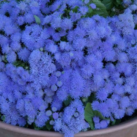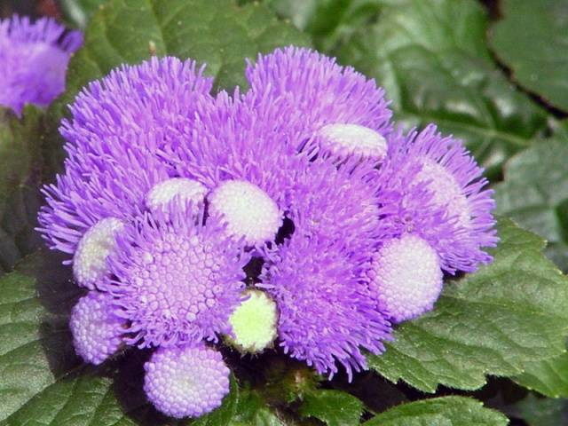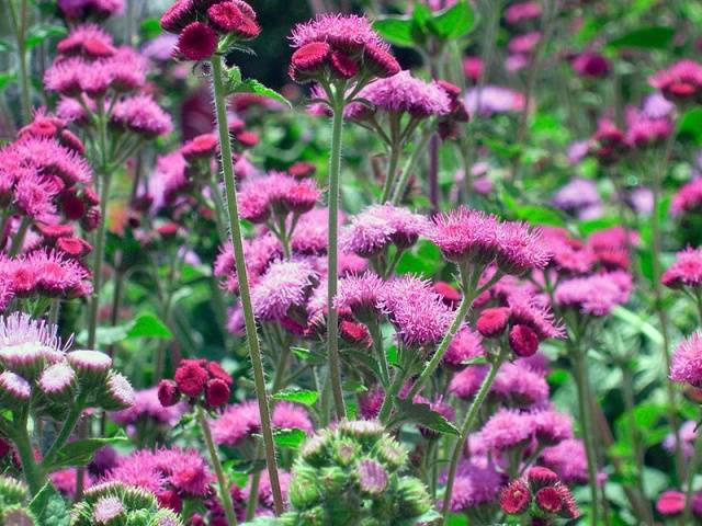 Fotos von schneeweißen, lila, lila und blauen Ageraten ähneln einem schwerelosen Dunst, der Blumenbeete und Ränder schmückt. Diese thermophile Blume hält selbst dem milden europäischen Winter nicht stand und wird daher in gemäßigten Klimazonen nur einjährig angebaut. Sie müssen flauschige Blumen mit Setzlingen vermehren, die der Florist zu Hause selbst anbauen muss.