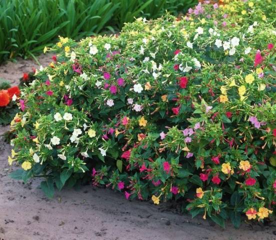 Es ist am besten, Mirabilis zusammen mit niedrig wachsenden und kriechenden Blüten zu pflanzen. Vor dem Hintergrund von Rosen, Dahlien, Pfingstrosen und anderen großblumigen Pflanzen geht Mirabilis verloren und sieht weniger beeindruckend aus.