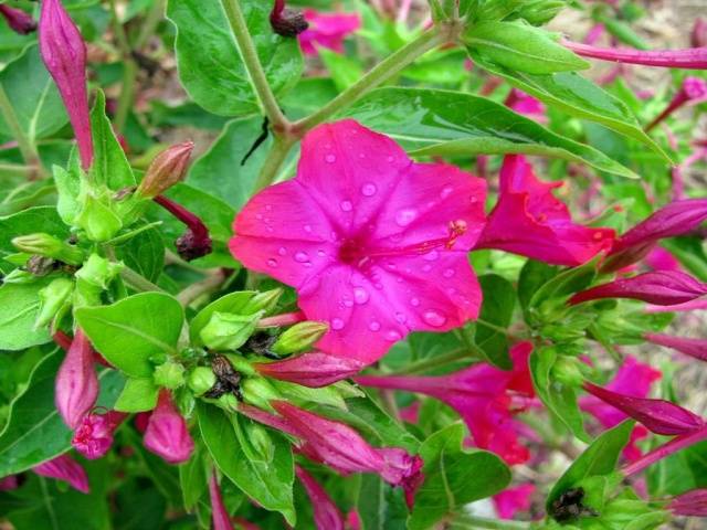Mirabilis Blumen Nachtschönheit verträgt Feuchtigkeitsmangel und Trockenheit gut. Wenn die Trockenzeit verlängert wird, wirkt sich dies negativ auf die Knospenbildung aus.