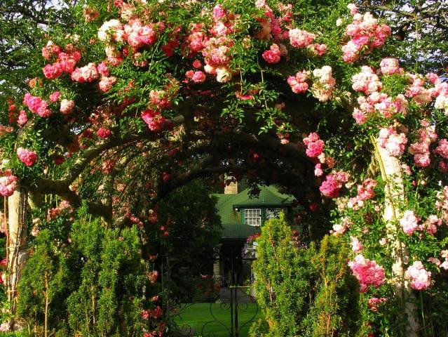 Kletterrosen können kaum als mehrjährige Schmerle bezeichnet werden. Aber keine Geschichte über Kletterpflanzen wäre vollständig, ohne sie zu erwähnen. Die Stütze für die Rosen muss stark sein und von Hand befestigt werden. Aber der Aufwand lohnt sich, um einen rosa Bogen, eine Pergola oder ein Gitter auf dem Gelände zu haben.