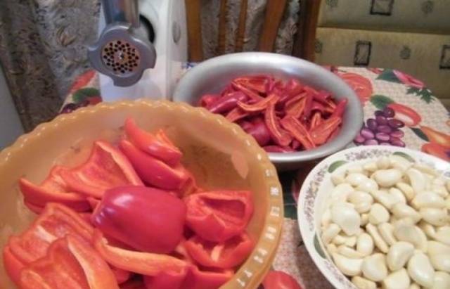 Mahlen Sie für Adjika zubereitetes Gemüse mit Knoblauch mit einem Fleischwolf.