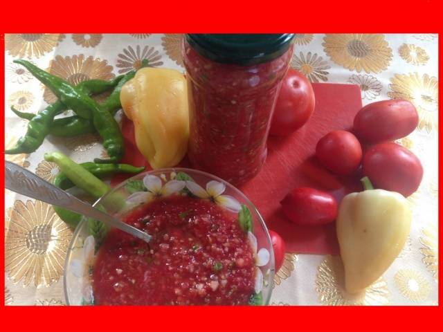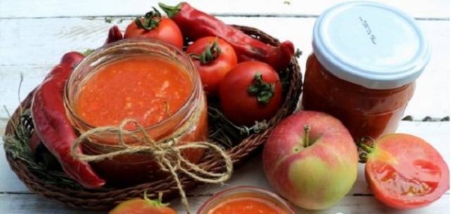 Diese Adjika wird aus Tomaten hergestellt mit Meerrettich und Paprika wird nicht nur Ihren Tisch diversifizieren, sondern auch als echte Barriere gegen Erkältungen dienen.